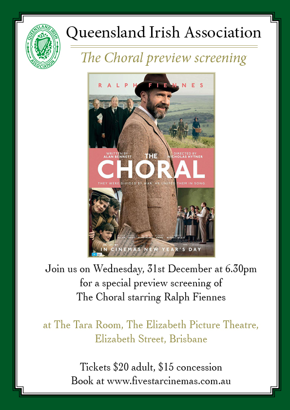 We are joining our good friends at Elizabeth Picture Theatre for a special preview screening of Ralph Fiennes in heartwarming and humorous movie The Choral at 6.30pm on December 31. It will be held in The Tara Room. What better way to spend New Year’s Eve?