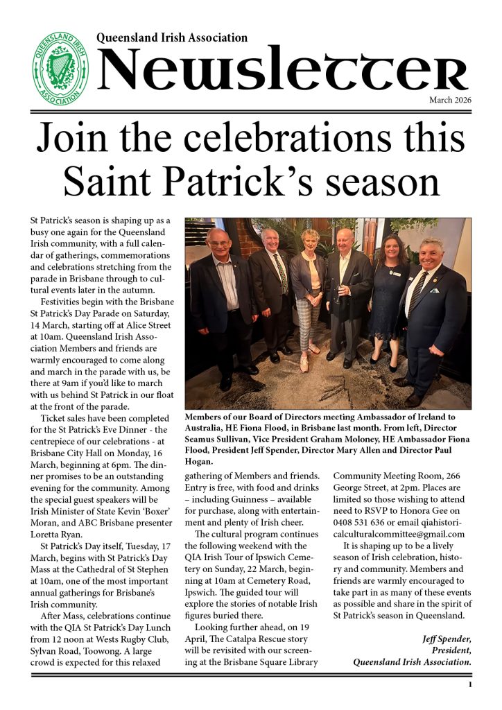 Welcome to the March Queensland Irish Association Newsletter. This Newsletter was emailed to our Members in early-March. If you’d like to receive QIA Newsletters straight to your inbox so you’re ahead of the news, sign up as a Member for just $20 per year.