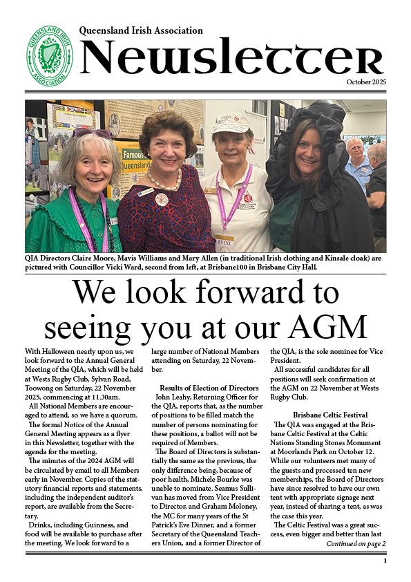 It has details of our upcoming AGM, photographs from our recent events, details of how you can see the Irish Film Festival online and Irish highlights at the upcoming British Film Festival. As you likely know, Halloween came from Ireland, where it was called Samhain, and to celebrate, we have our first Halloween event. It’s a night-time walk with spooky stories at South Brisbane Cemetery and we would love you to join us!